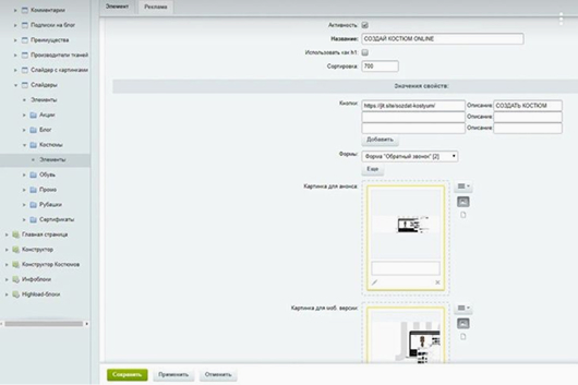 Администратор сайта должен иметь возможность настраивать цвет, прозрачность фона и назначать модальные окна на определенные кнопки на слайдах -